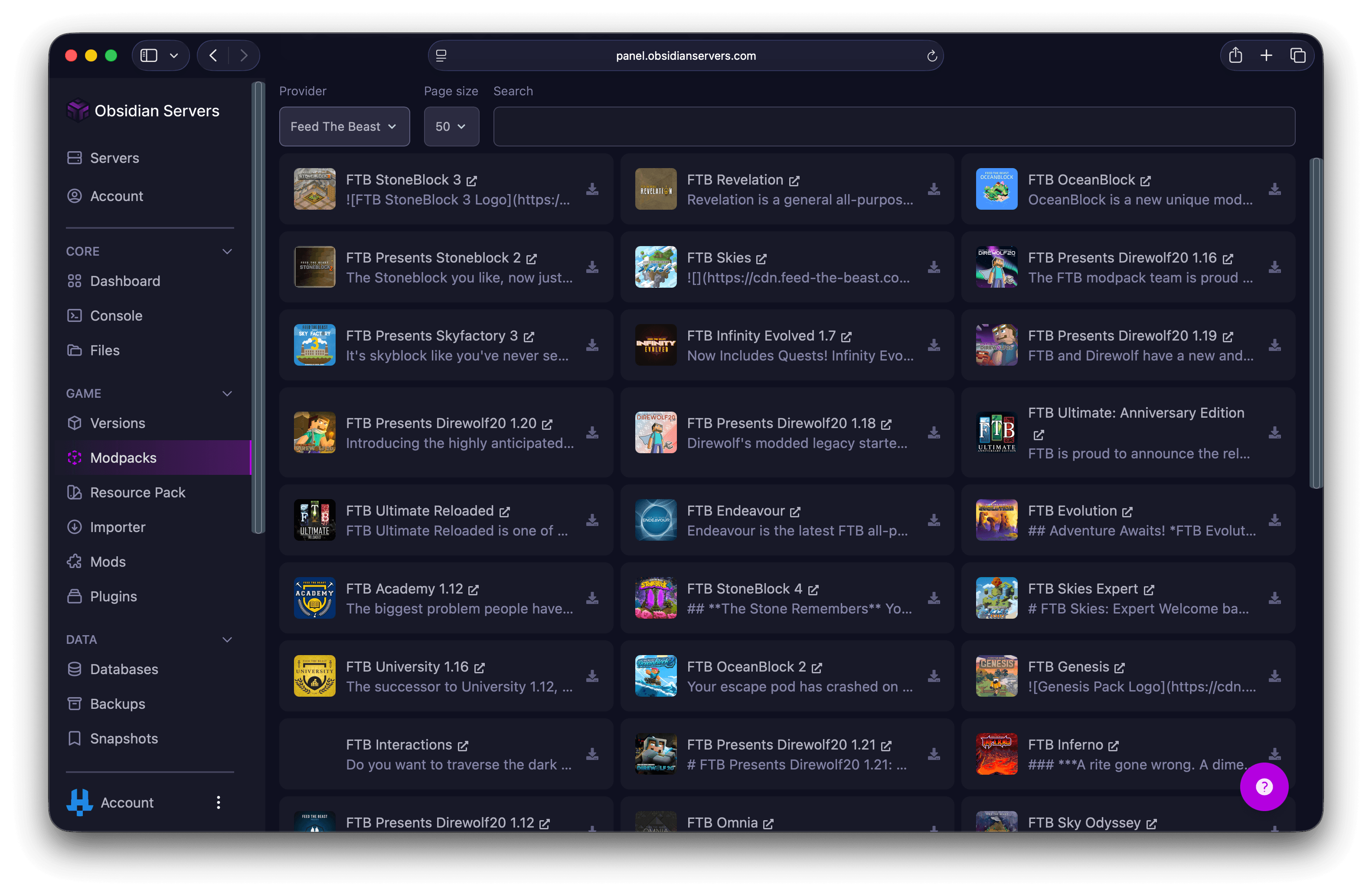 The Game Panel includes a built-in modpack installer that lets you browse and install modpacks directly from your browser. It supports modpacks from several popular platforms including Modrinth, CurseForge, Feed The Beast, ATLauncher, Technic, and Voids Wrath.