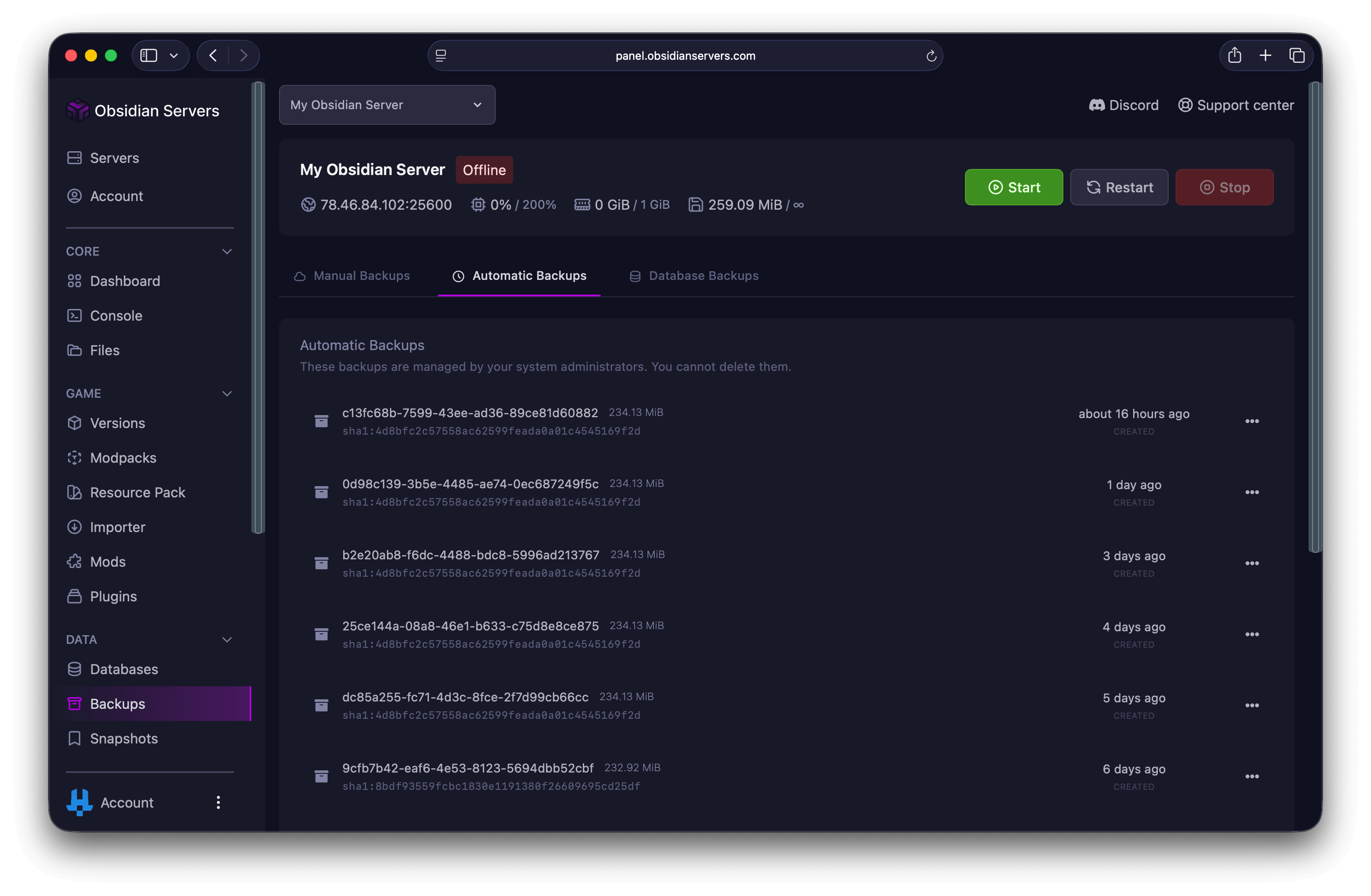 Backups save a copy of your server files and can be restored at any time from the Game Panel. All backups are stored off-site on a separate system from your server, providing reliable long-term redundancy and protection against hardware issues.