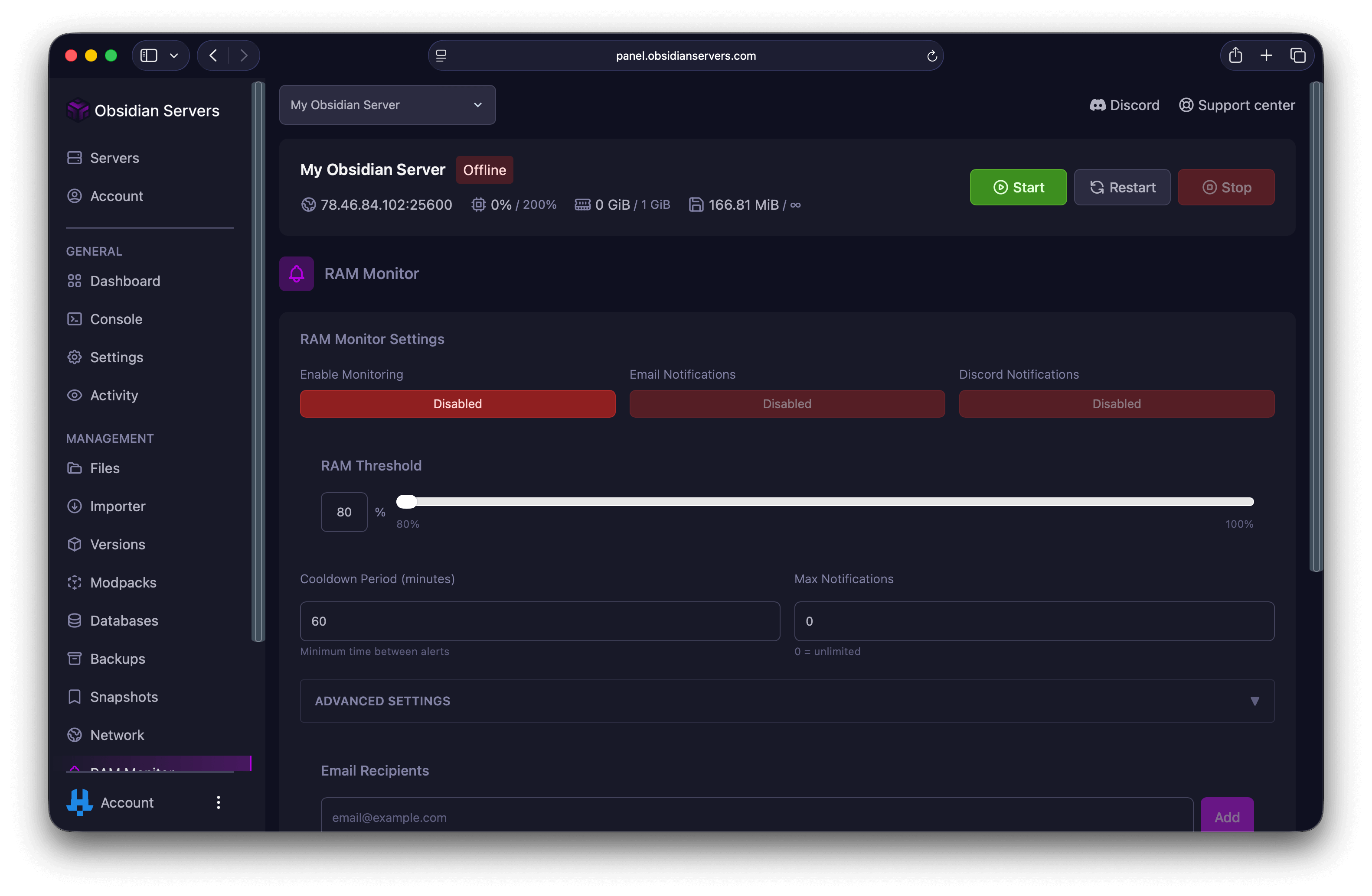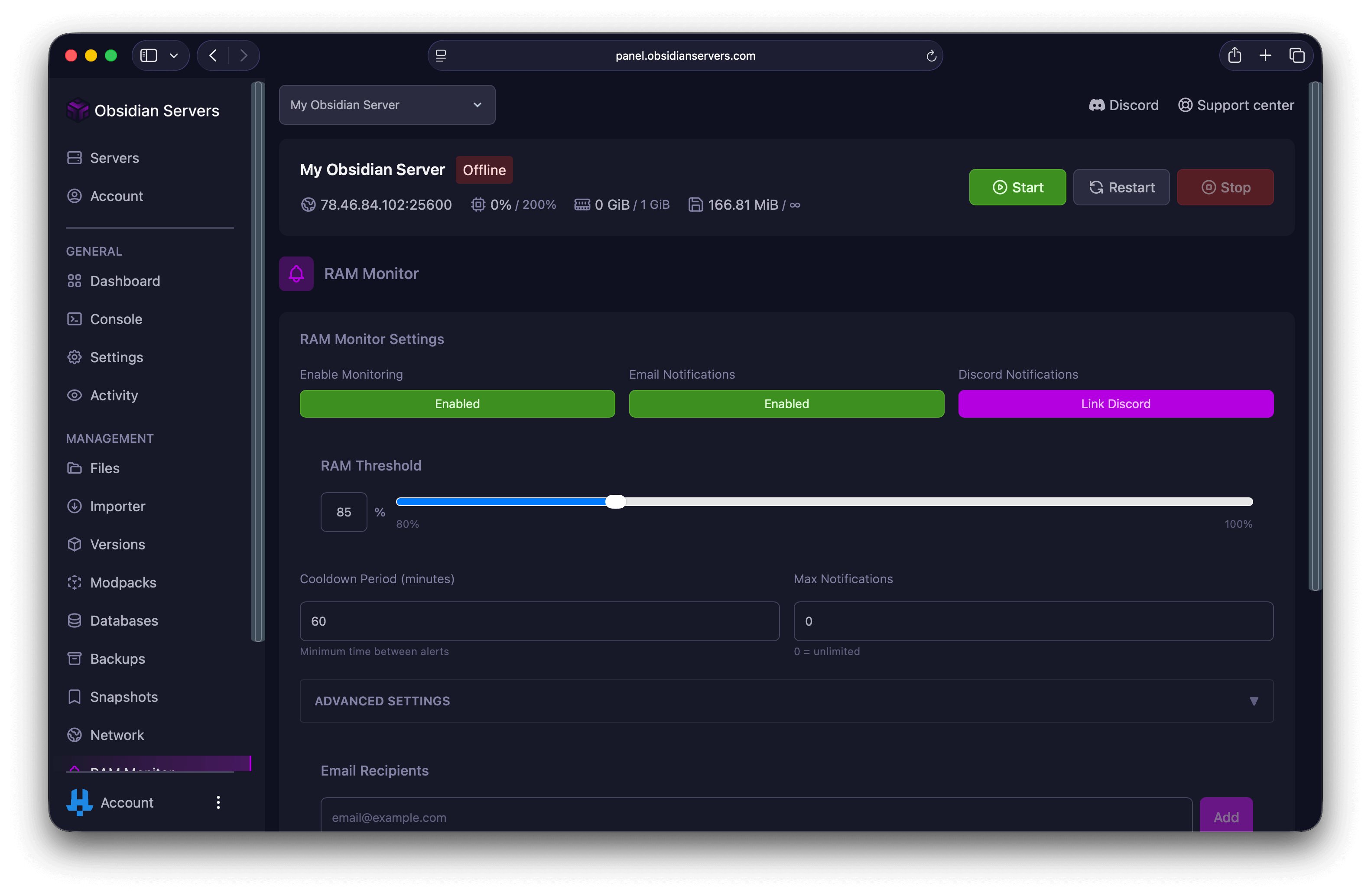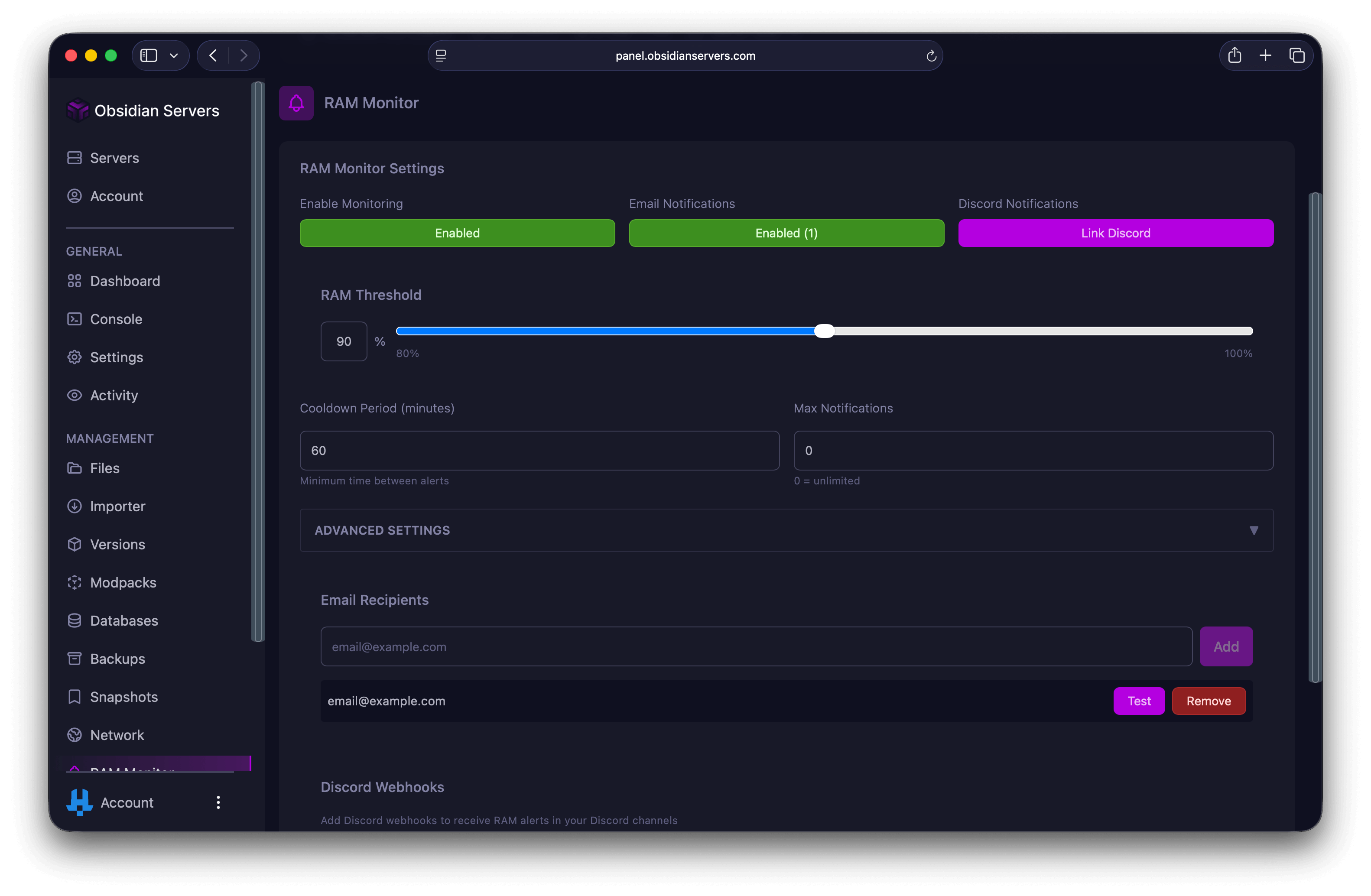 The RAM Monitor tracks your server's memory usage and sends alerts when it exceeds a threshold you set. This helps you identify memory issues before they cause lag or crashes.