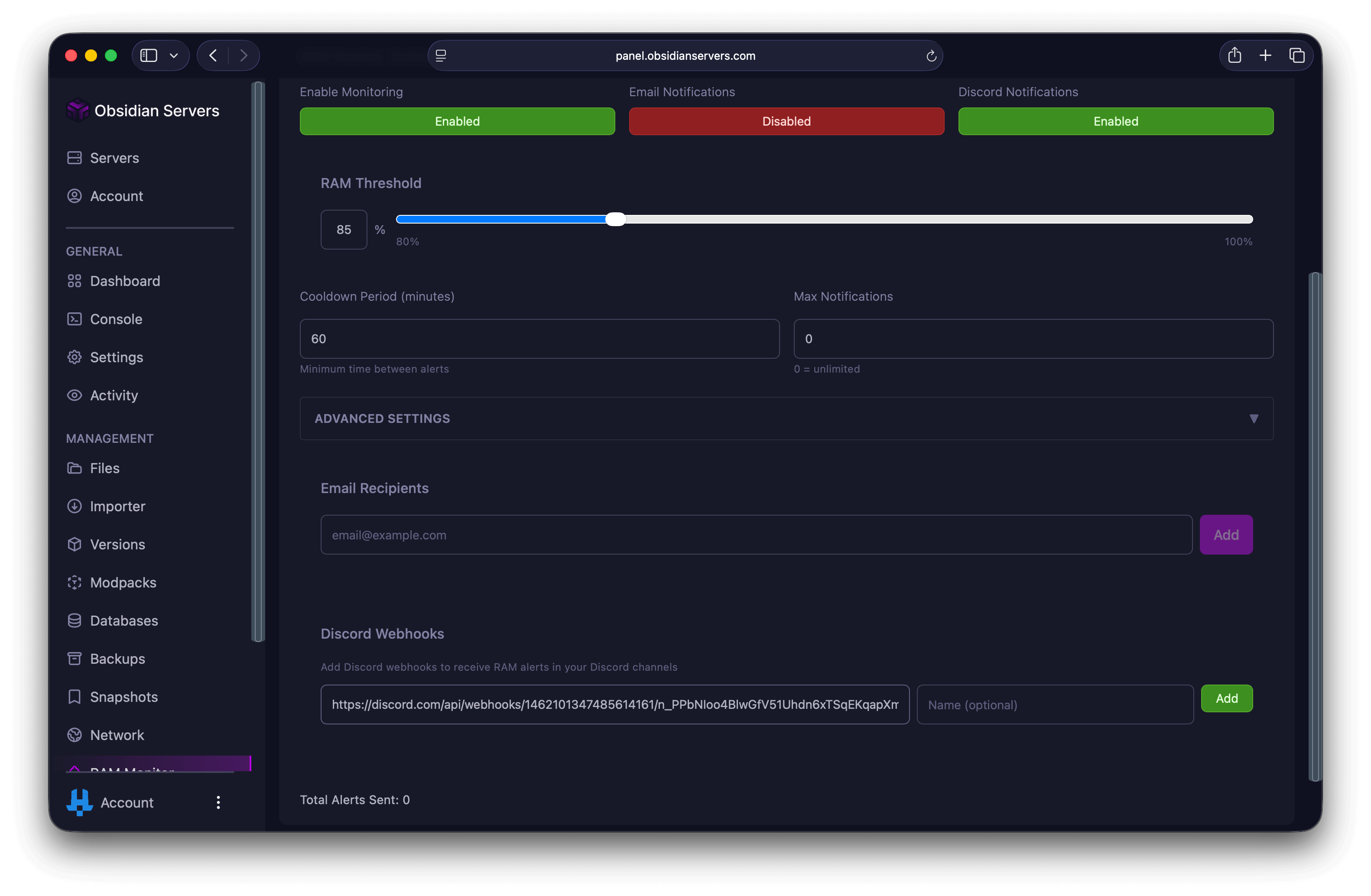 Send RAM alerts to a Discord channel using webhooks. This is useful for team servers where multiple people need to see alerts.